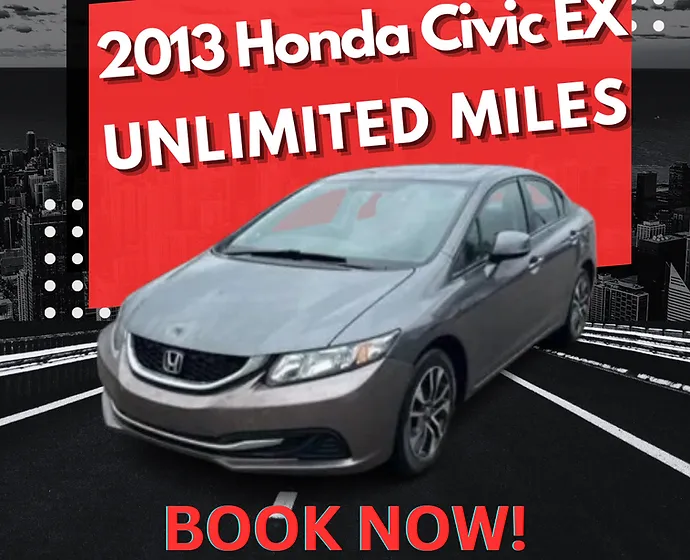 Drive with ease in the reliable 2013 Honda Civic EX from No Frills Cars. Our cheap rentals and unlimited miles make this the perfect companion for your daily hustle. With our commitment to maintaining your ride, we take care of oil changes and tire repairs, ensuring your focus stays on the road ahead. Experience the comfort, efficiency, and affordability you need to thrive. Rent this car, and you'll want it.